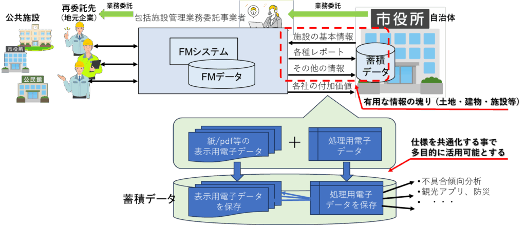 包括施設管理業務委託においては、自治体と委託先の事業者との間でやりとりする電子データに共通データ仕様を採用する事により共通化します。