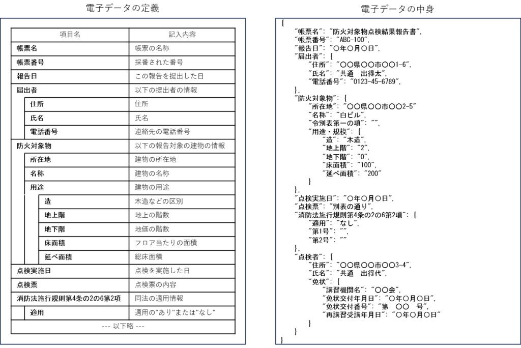 まずは、「データモデル」の説明の前に電子データについて説明します。電子データとはコンピュータ用に作られた帳票の事です。帳票とは、紙(やpdfなど)に項目が並んでいるものですが、例えば請求書や住民票などの事です。ここで電子データの一例を示します。下図は、「放火対象物点検結果報告書」という人間向けに策定された帳票のひな形です。
