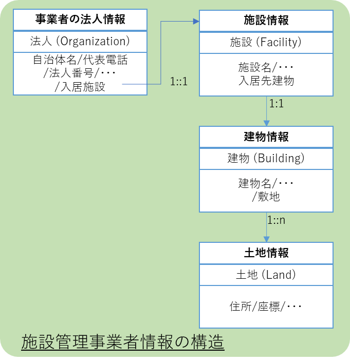 これらの情報を登録する訳ですが、自治体と同様に下図のように、「法人(Organization)」、「土地(Land)」、「建物(Building)」、および「施設(Facility)」に一括して登録します。